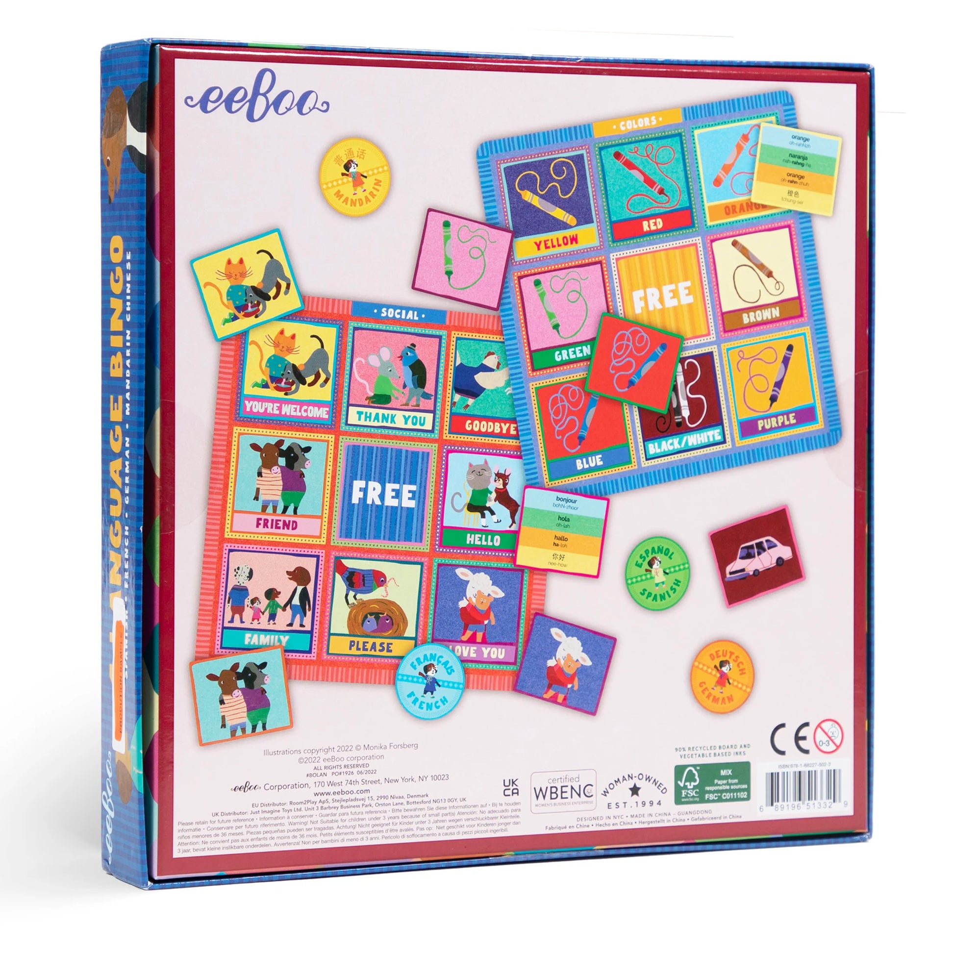 Build young brains through excitement and fun with this Four Language Bingo covering Spanish, French, German and Mandarin Chinese. Designed for ages 5+ and suitable for up to 6 players going head-to-head, this bingo set features beautifully illustrated everyday items covering a number of categories - food, clothes, numbers, colors, social terms and vehicles. Illustrated by Monika Forsberg. Play the game in one language or increase the challenge by switching between the 4 each time you pick an item token. The first to fill their card wins and proves their increasing knowledge! A handy pronunciation guide is also included so players, young and old, can perfect their delivery as they play.