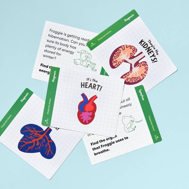 - HANDS-ON LEARNING: Diagnose Froggie's symptoms using game cards, identify which organ is troubled, and “operate” to make Froggie feel better!