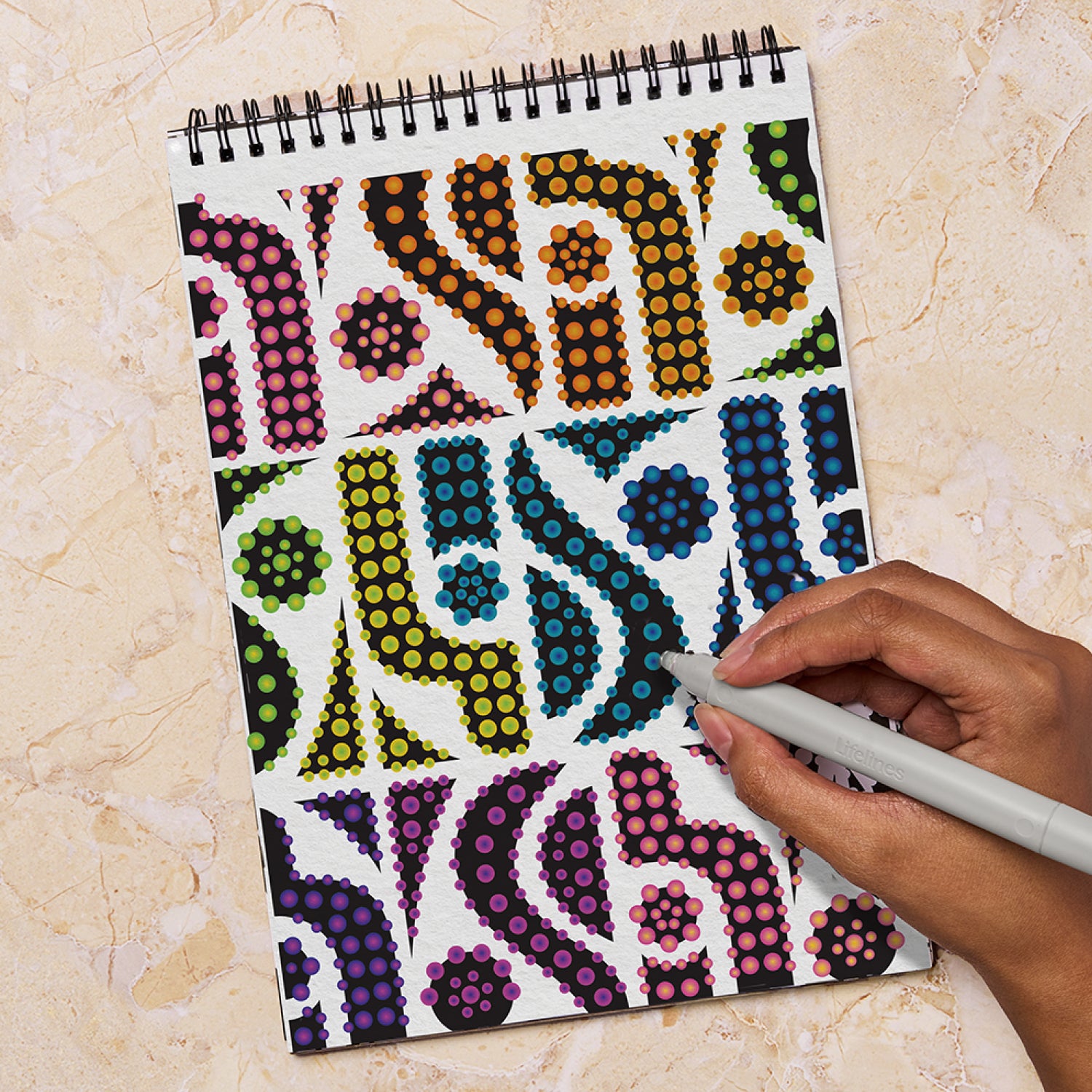 Lifelines FlowArt Pads are guided art meditations designed to help you achieve a calming flow state. Each scene is thoughtfully crafted to encourage repetitive, relaxing movements, promoting mindfulness and reducing stress.