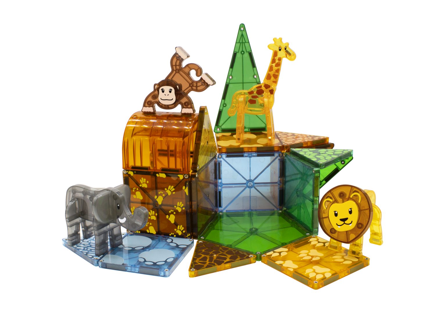 Anything can happen in the wild! Start your expedition with the Safari Animals 25-Piece set for a roaring good time. Monkey around with magnetic, savannah-themed tiles as you explore the vibrant-colored habitat with your four safari sidekicks. Jump into imaginative play and screen-free fun while going on an absolu-tile-y wild adventure through canopies, treetops, and hidden alcoves.