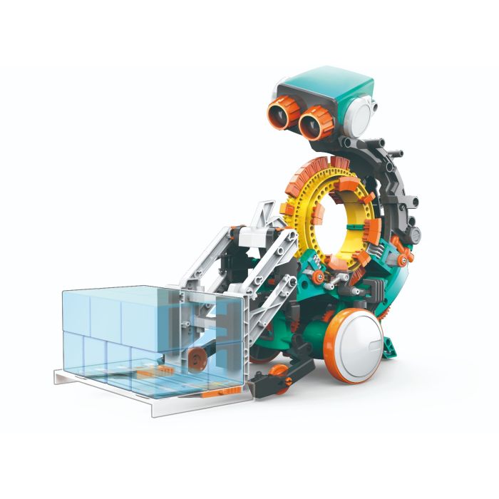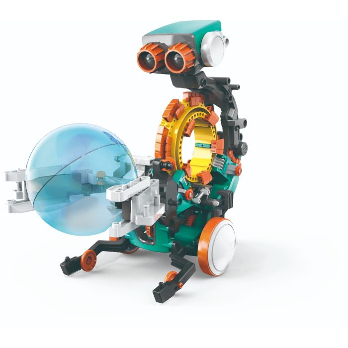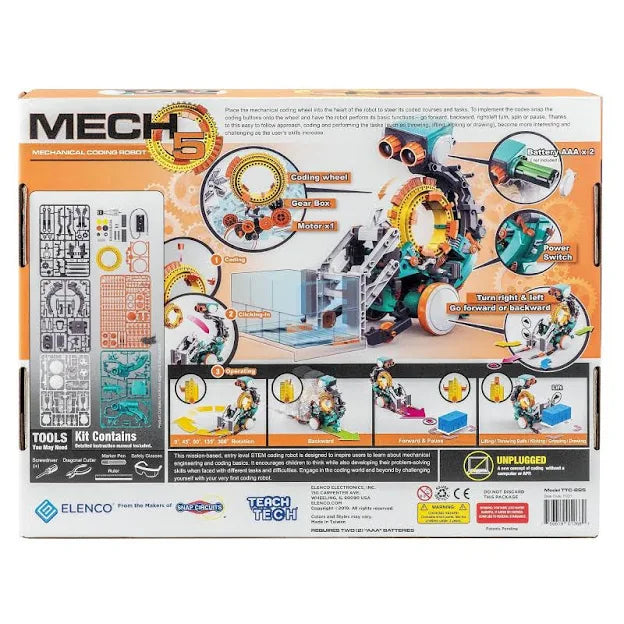 Truly innovative-screenless coding. A mission-based STEM coding robot with a mechanical coding wheel, instead of a computer. Mech-5 is “unplugged” – a new concept of coding without a computer or app. Just snap coding buttons onto the coding wheel to initiate movement such as forward, backward, turn, spin, or pause. Screenless coding