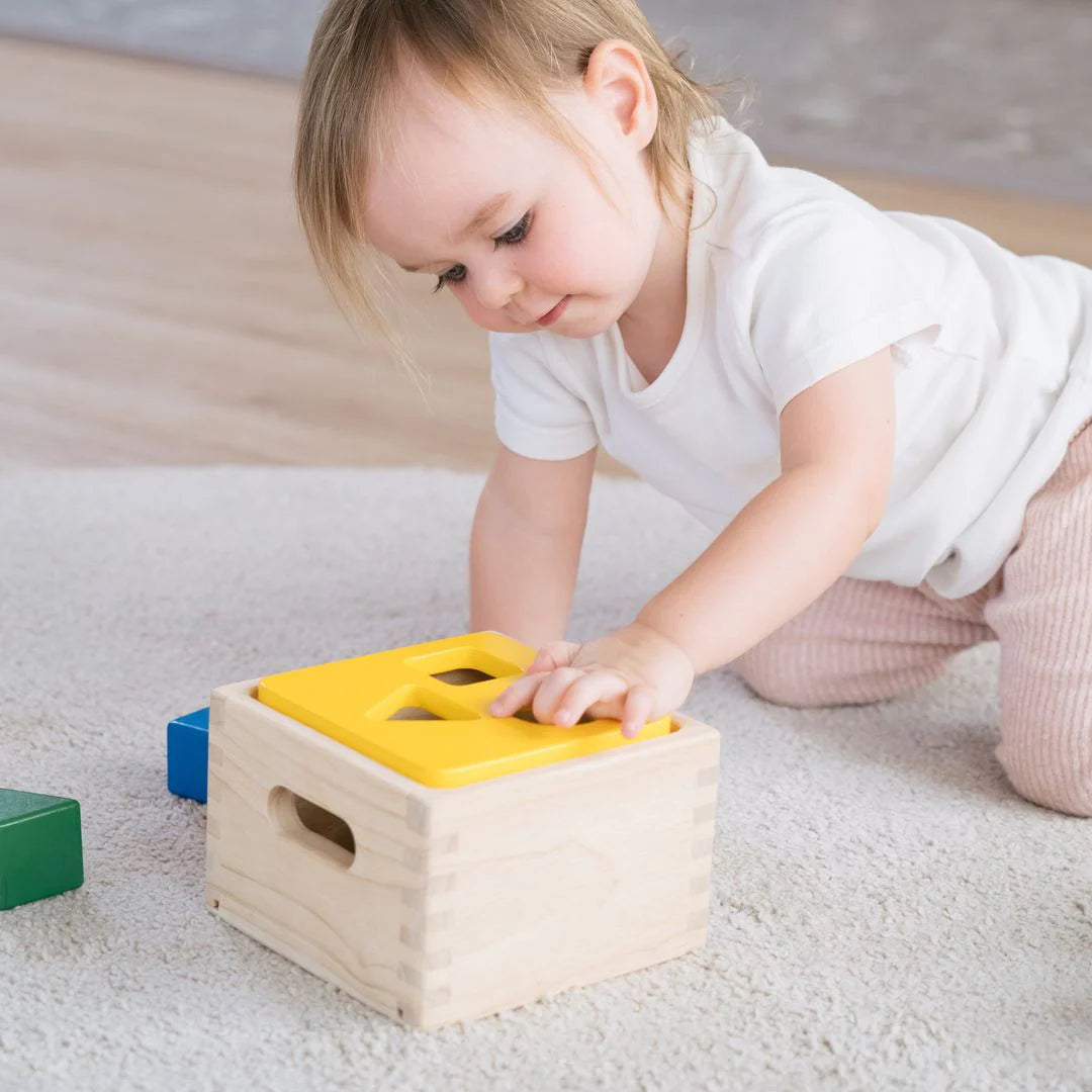 - Set features 3 colored wooden shapes and a puzzle box punctured for shape placement