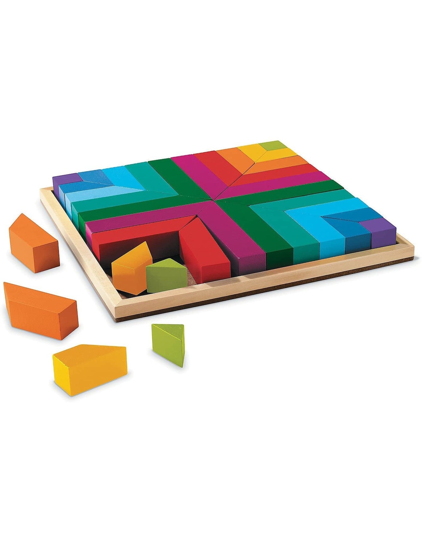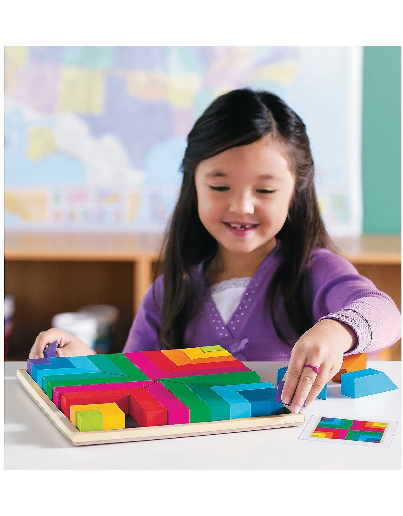 Problem solving becomes a rewarding work of art with Pattern Play: Color by Design! Use these brightly-colored blocks in varying shapes and the pattern cards to introduce significant math concepts like sorting, matching, symmetry, congruence and fractions. Pattern cards are numbered in order of difficulty, ranging from beginner to expert. With each dazzling build becoming more challenging, patience and confidence is gained through trial and error. The blocks can also be used to create endless freeform designs, providing hours of engaging creative play. Pattern Play is a quality learning tool that every household should own!