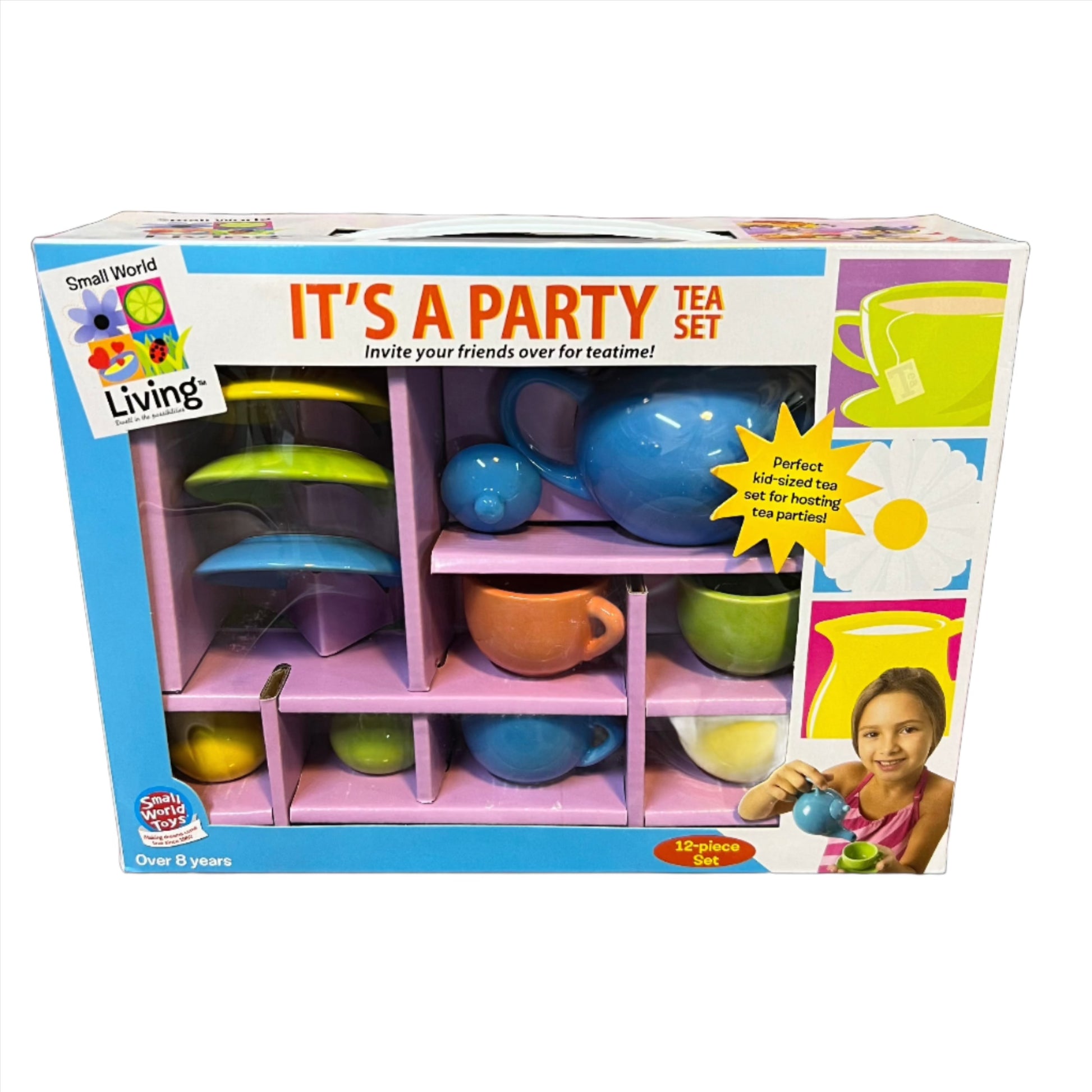 Your little ones will love setting up to have their own tea party with the It's a Party Tea Set from Small World Toys. Designed for ages 5 years and older, this dishwasher safe porcelain set is durable and realistic-looking---little girls will love setting up their party just like mom's! This 12-piece set includes 4 cups, 4 saucers, 1 teapot, 1 teapot lid, 1 sugar bowl, and 1 creamer.