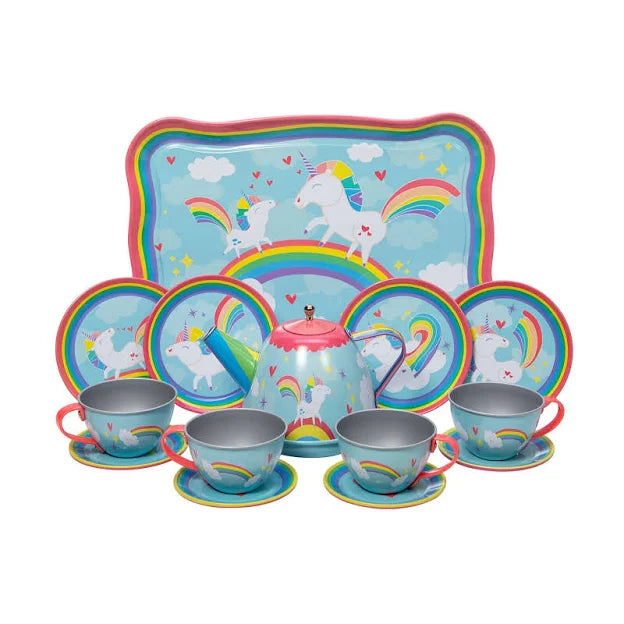 The Unicorn Tin Tea Set from Schylling Toy, the world's leader in traditional toys and classic fun, brings the magic of Unicorn's to life. A beautiful 15 piece tin tea set featuring everyone's favorite fantasy creature, all wonderfully decorated with whimsical unicorns and rainbows.
