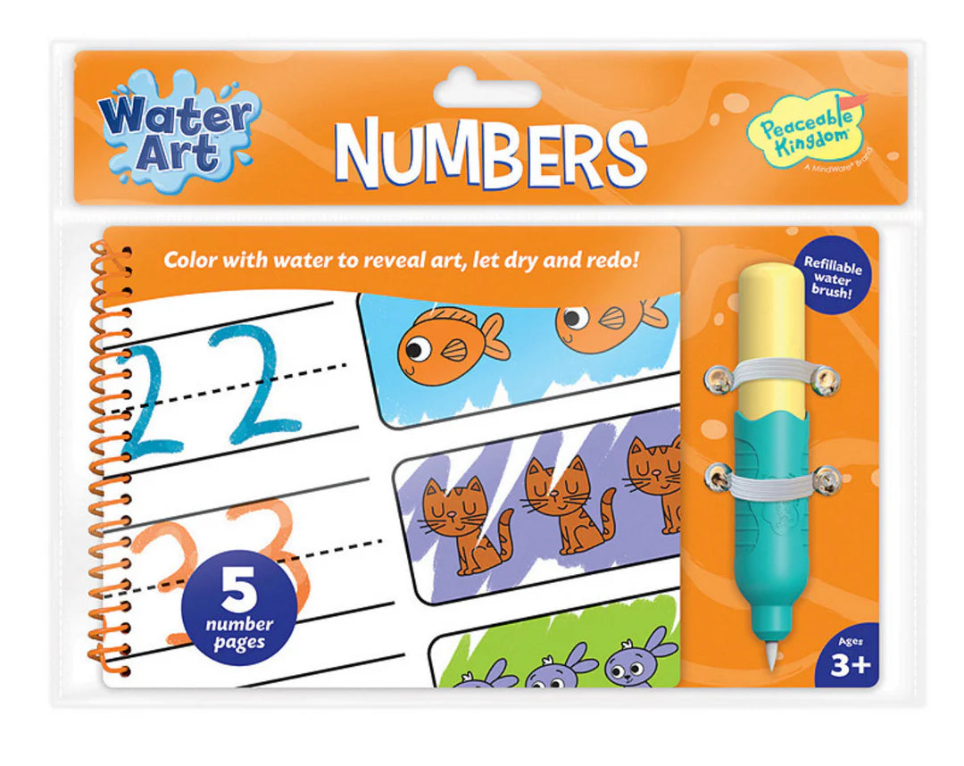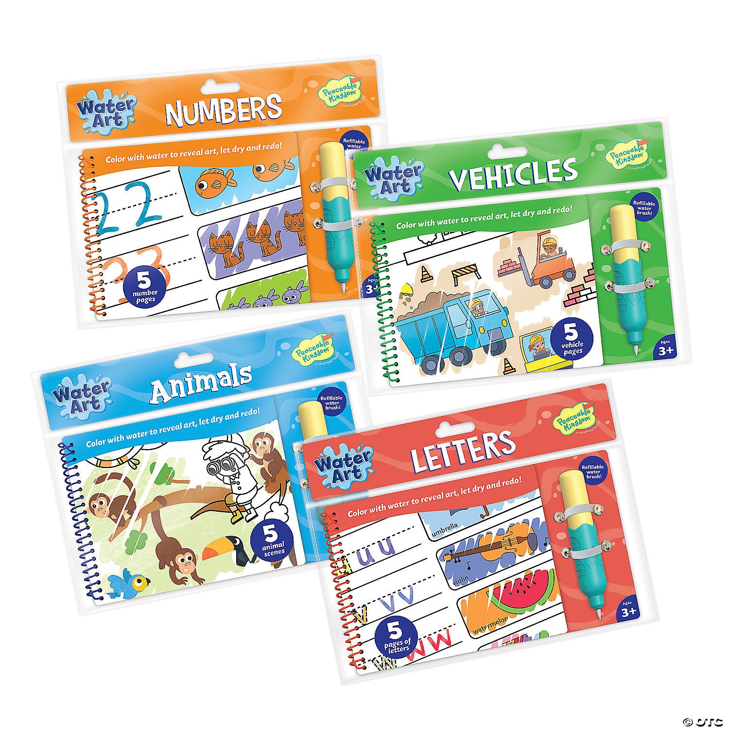 These refillable water brushes are great for practicing writing, counting and more. Kids will have a blast revealing colorful scenes, which disappear when dry to be revealed again and again. Featuring Numbers, Vehicles, Animals and Letters, these mess-free educational activities are perfect for on-the-go fun!• Color with water to reveal art, let dry and redo• Practice fine-motor skills• Set of 4 Water Art Books: Numbers, Letters, Animals & Vehicles each containing 5 fun scenes• Includes refillable water pen•
